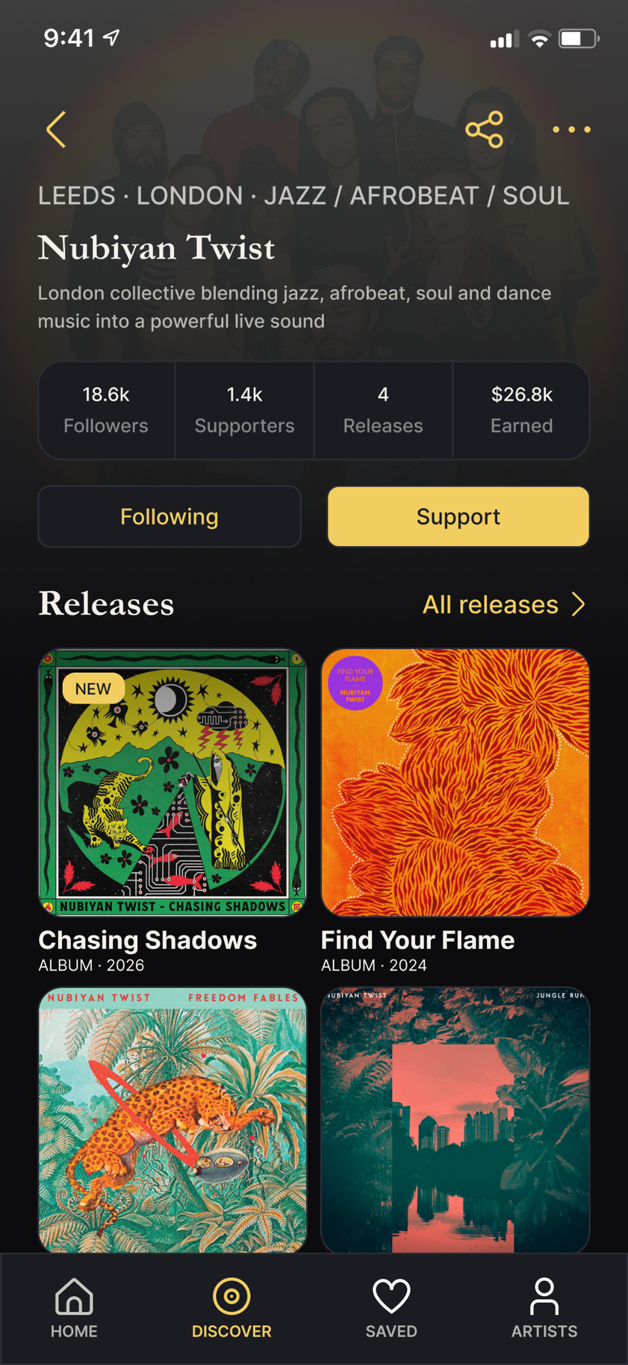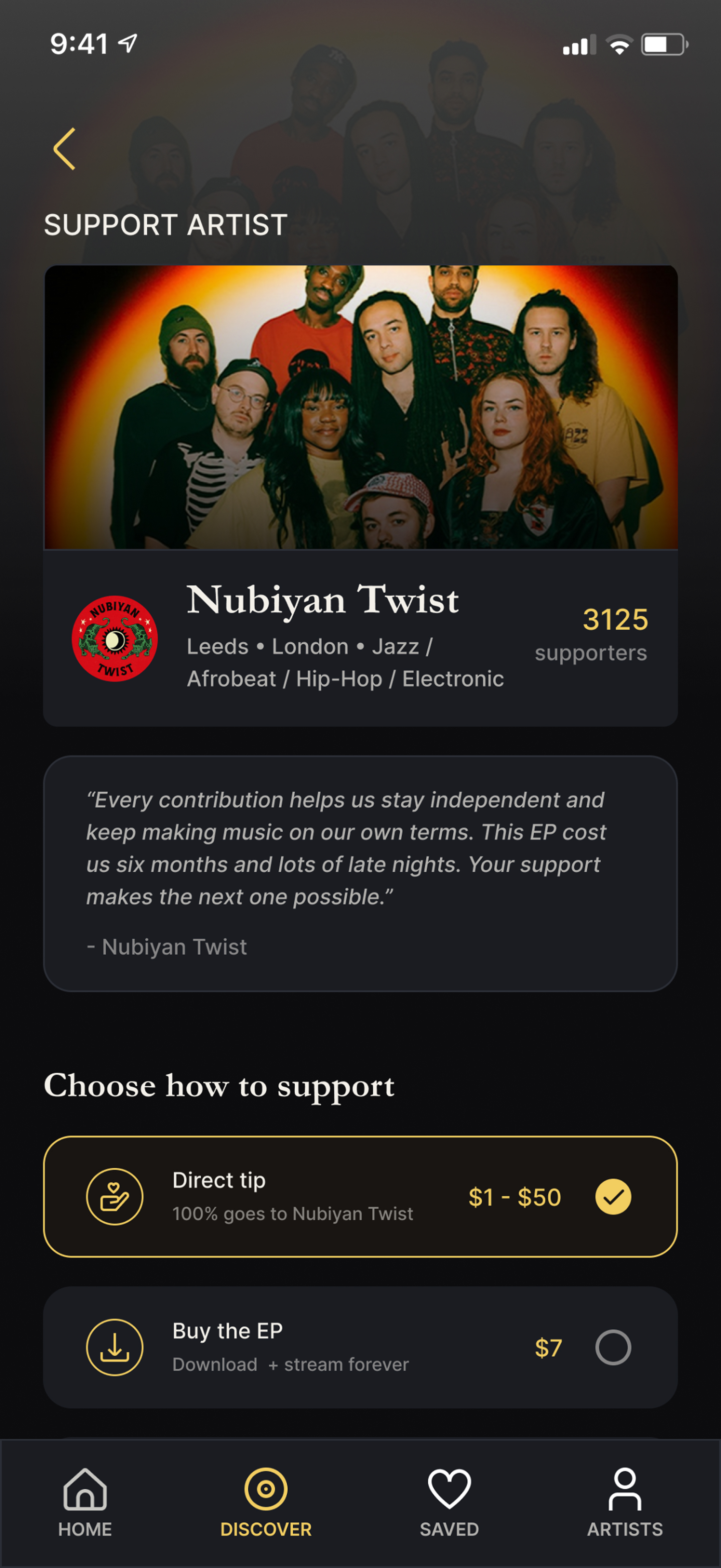 Support is built into the same journey through flows for tips, merch, vinyl and memberships, allowing fans to act on interest without leaving the product.