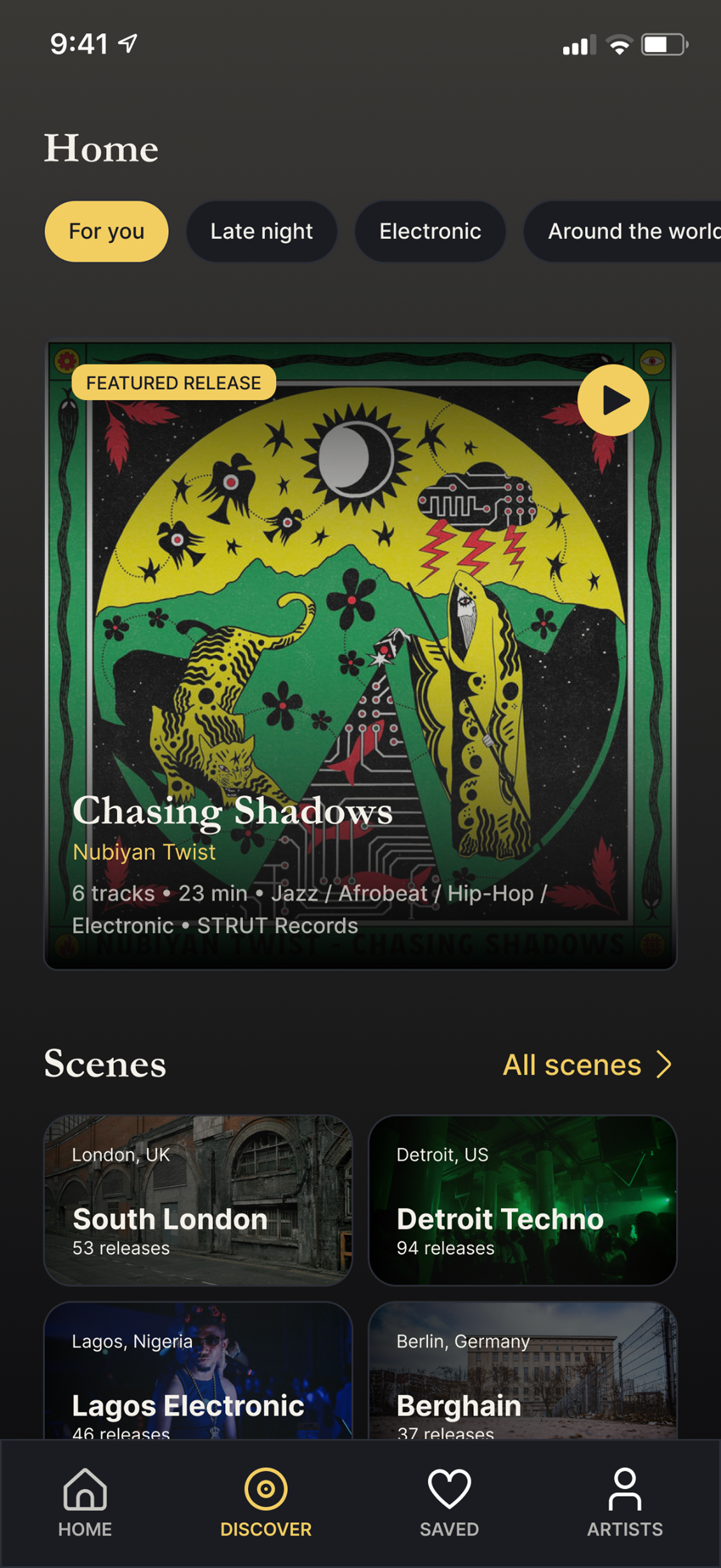 The core listener journey starts with the Home and Discover screens, where music is surfaced through artwork, scenes, moods and curators rather than dense lists. From there, users can move into the Artist Profile, Player and Release Page, which create more space for identity, context and listening.